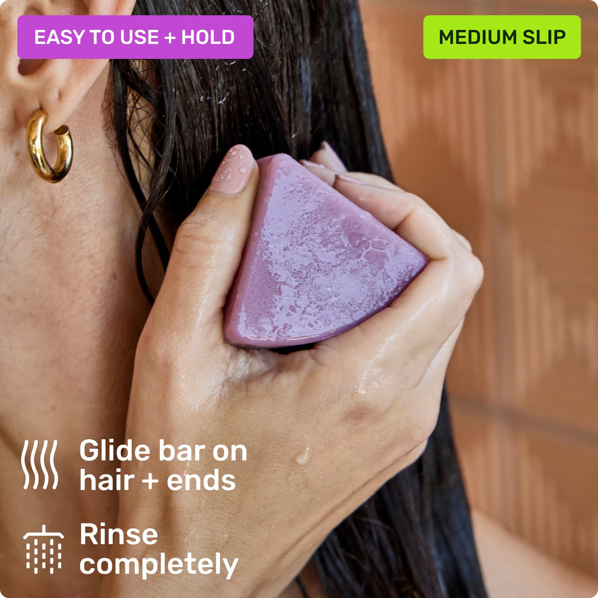 - Post-shampoo, glide bar onto wet hair from mid-lengths to ends. Distribute evenly. Rinse completely.